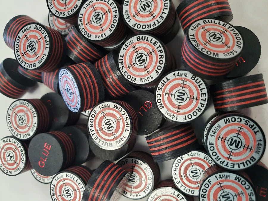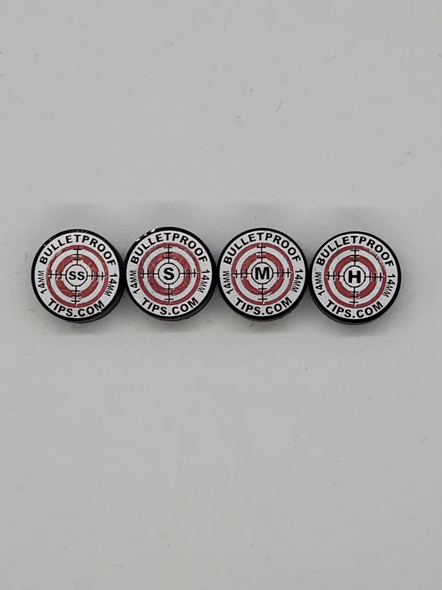 Bulletproof A.I.M (Accuracy Improving Multi-Layer) playing tips are made from 11 layers of hand-selected premium Japanese pigskin. More layers mean better consistency, less mushrooming, and increased performance. Bulletproof A.I.M Tips are available in 14MM and come in Super Soft, Soft, Medium, and Hard to give every player the feel they desire. From the company that brought you the world's greatest break tips comes the next level in playing tips. Take A.I.M at your competition!