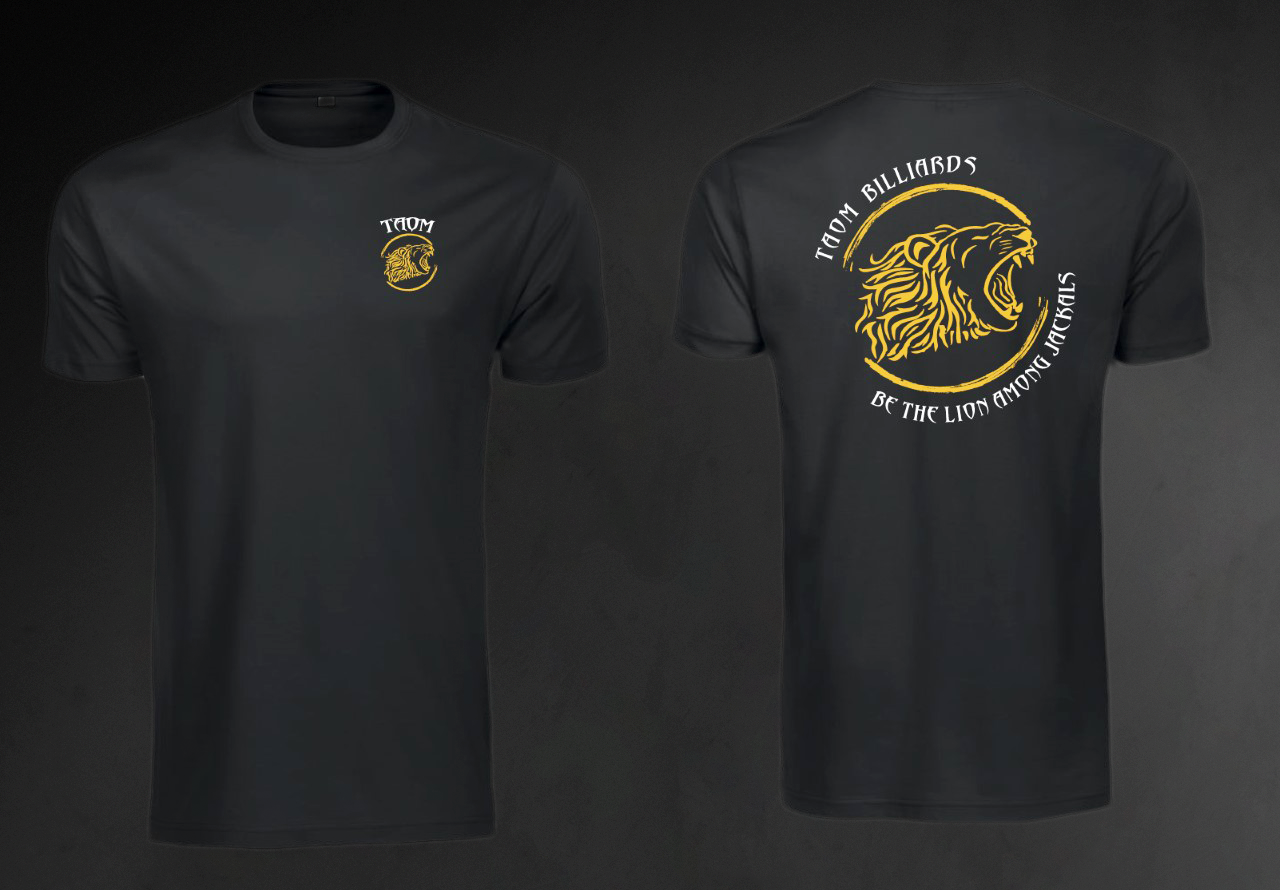 Are you a lion among jackals? Let the world know with this comfortable t-shirt displaying a small Taom lion logo and wordmark on the front and a larger lion logo on the back between text saying “Taom Billiards” and “Be the lion among jackals”.